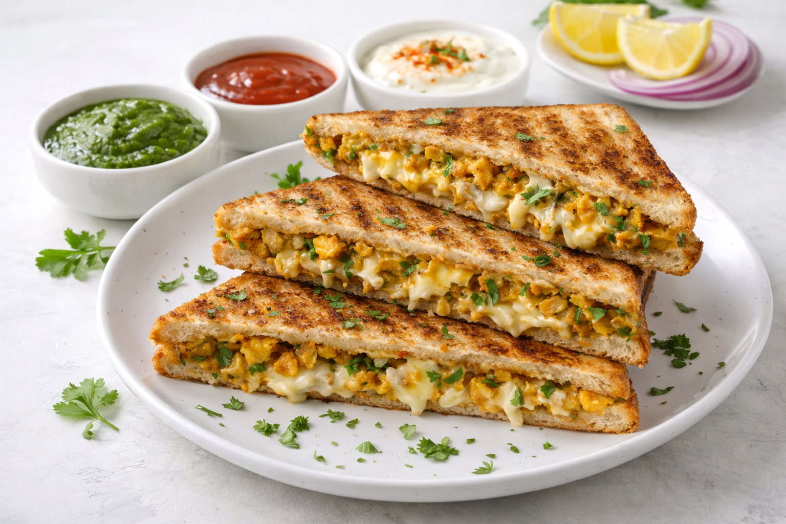 Grill the sandwiches and serve with any dip of your choice.