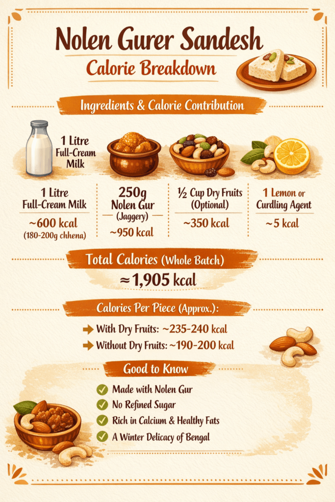 Here is elaborate breakdown of Nolen Gurer Sandesh calories presented in the infographic chart below: